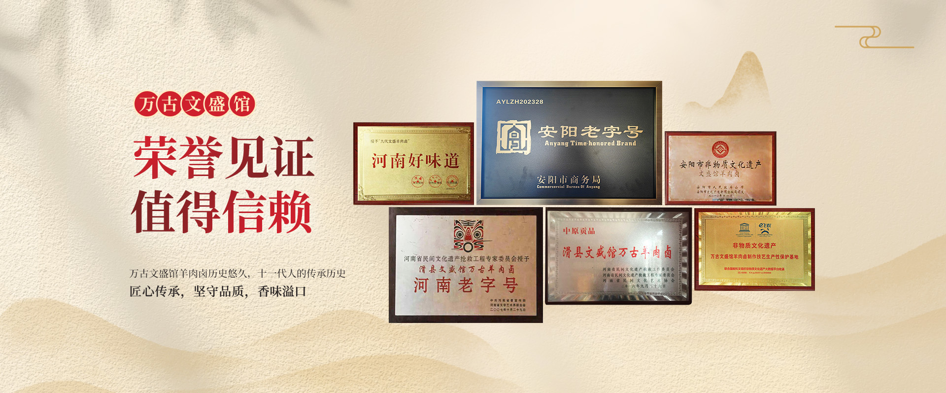 萬古文盛館羊肉鹵,始創于清順治二年(1645年),發源于滑縣萬古鎮梁村集,俗稱“萬古羊肉鹵”,先后歷經王氏家族十幾代人的傳承歷史,逐步積淀成今天的美味佳肴和獨門絕技。萬古文盛館羊肉鹵歷史悠久,內涵豐富,工藝復雜,風味獨特。依靠祖 傳秘方制作,被譽為中原名饈。咸豐年間曾作為宮廷御用貢品?!痘h志》有“東西南北都吃遍,不如萬古羊肉面”、“隴饌有熊臘,豫烹唯羊鹵”之載述。 王氏家族先人,在“梁王城”(今萬古鎮梁村集)開飯館為生,用羊肉做鹵湯。一天,他在炸制羊油加入大料準備下肉時,一不小心將醋壇打翻在鍋臺,陳年老醋灑入熱油鍋中,隨即油煙沸騰,異香四射,頓時繚繞在大街小巷。這種氣味令人為之一振,隨后,眾人紛紛打探味從何來,并循著氣味來到了王家飯館,大家驚訝之后給以盛贊。王氏先人弄拙成巧,因失誤得法。他遂將羊肉館取名為:“聞盛館”(聞味盛贊之意)。聞盛館常有文人詩客相聚,談天說地,詠詩作對。 一天,乾隆便裝游歷“玉皇閣”時,食欲陡增,饑餓難耐,便問及地方美食,答曰:有一“聞盛館”,常有文人詩友聚之,乾隆隨喚地方官呈至,食后大喜,贊曰:“‘聞盛館’者‘文盛館’也”(文詩墨客盛聚之意)。 從此以后,因乾隆樹名,“萬古文盛館羊肉鹵”自然替代了“聞盛館”之名,而被喚至今。 后來,王氏先人不斷用醋加以調試,并創新了食醋的獨特制作工序和味道,在質量和品位方面,一次次研究總結,直到自己完全滿意為止。這種佐以秘制醋的妙用,使羊肉鹵不僅去除了原有的膻、腥、膩,還使味道芬芳溢口,粘齒留香,更醇更厚——令人回味悠長,久久難忘。